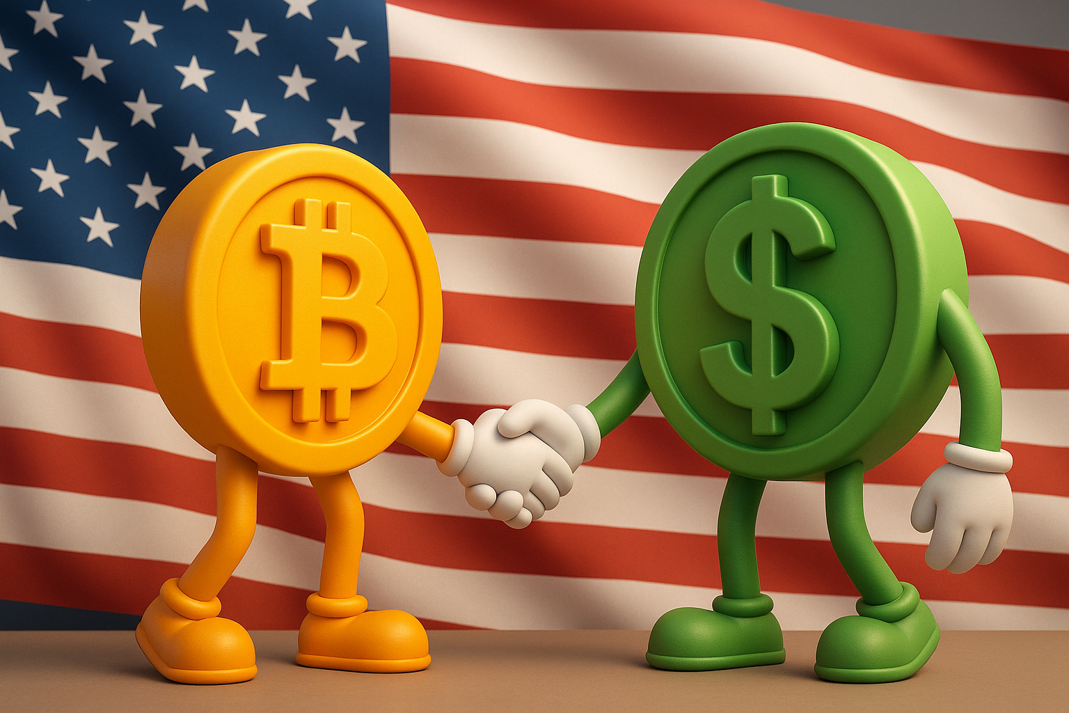 Anthropomorphised Bitcoin and US Dollar characters shaking hands in front of an American flag, symbolizing the growing alliance between crypto and traditional finance.
